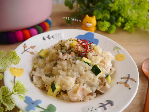 9、米飯煮到喜歡的熟度,加入櫛瓜稍微拌炒一下,並加入胡椒粉或鹽巴調味,美味的燉飯就完成囉!